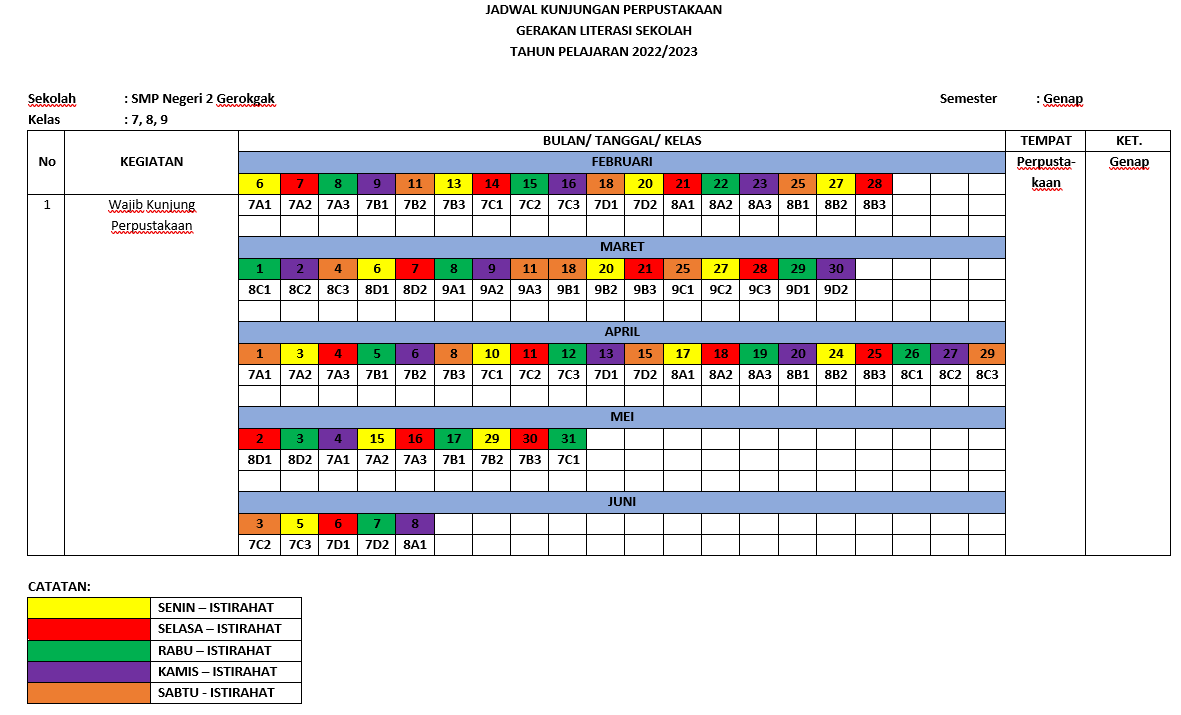 Info Sekolah JADWAL KUNJUNGAN PERPUSTAKAAN SEKOLAH Tanggal : 08/02/2023 Kembali ke AtasInfo Sekolah Lainnya :Pengumuman Penerimaan Murid Baru Tapel 2025/2026PENGUMUMAN KELULUSAN TA. 2024/2025SISTEM PENERIMAAN MURID BARU TAPEL 2025-2026Hasil PPDB TP 2024/2025Info PPDB 2023/2024